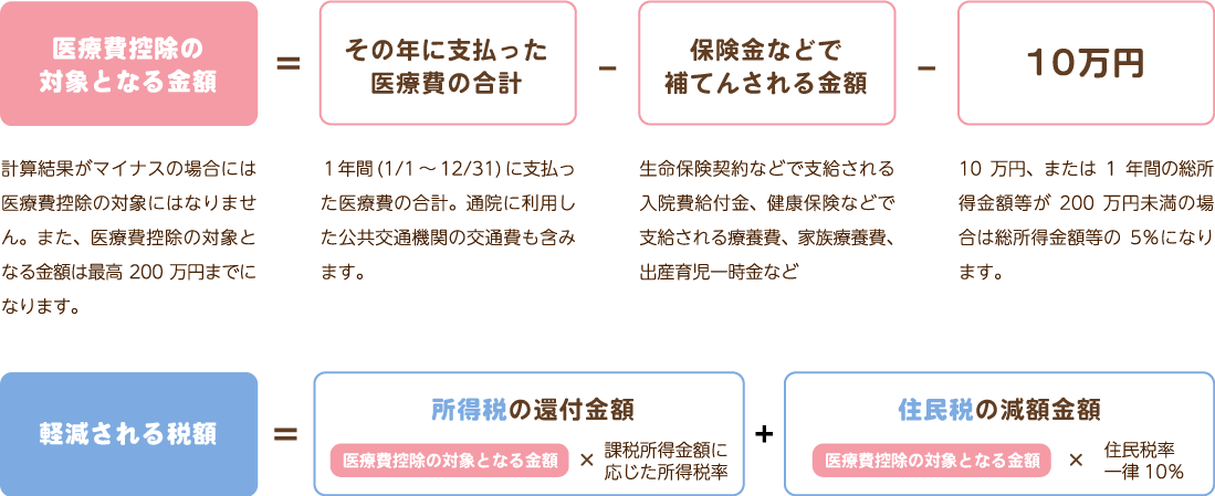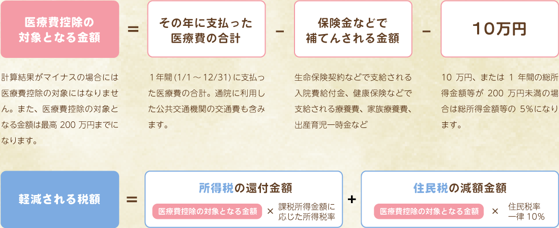 医療費控除とは、ご自身や、生計を一つにする配偶者、その他の親族のために1年間(1/1〜12/31)に支払った医療費の合計が10万円(総所得金額等が200万円未満の場合は、総所得金額等の5%の金額)を上回った場合、確定申告の手続きによって一定の金額を所得金額から控除できる制度です。また、過去の分についても、「申請したい年の源泉徴収票」「書類」「医療費の領収書」が揃っていれば過去5年間にさかのぼって医療費控除が受けられます。